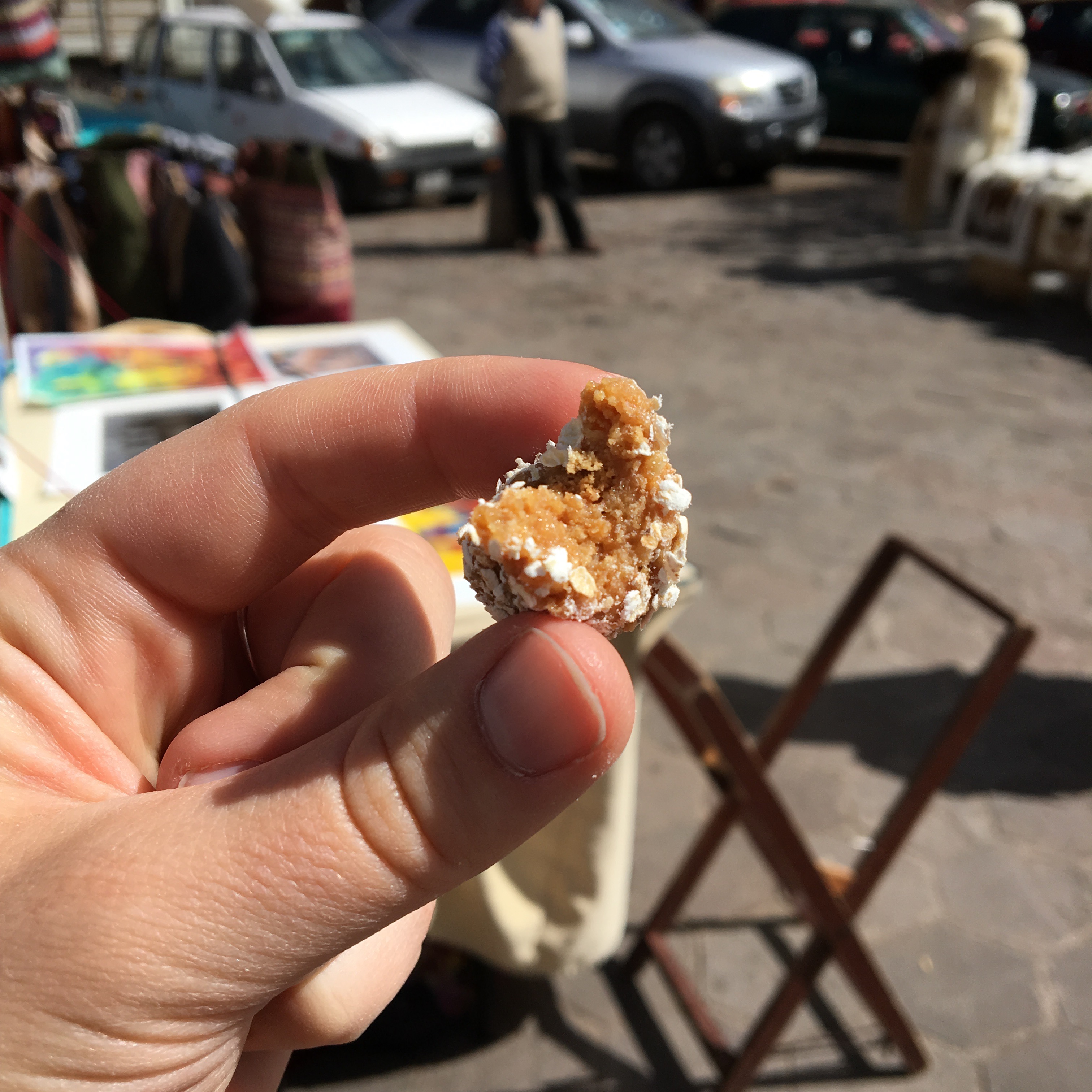 IMG_9157 Published July 2, 2016 at 3024 × 3024 in The perks of being a backpacker I bought this traditional Argentinian sweet (made of oats, dulce de leche and some other ingredients) from a couple that made them and is now selling them for 1 sole (0,27€) in order to save money to travel on to Lima