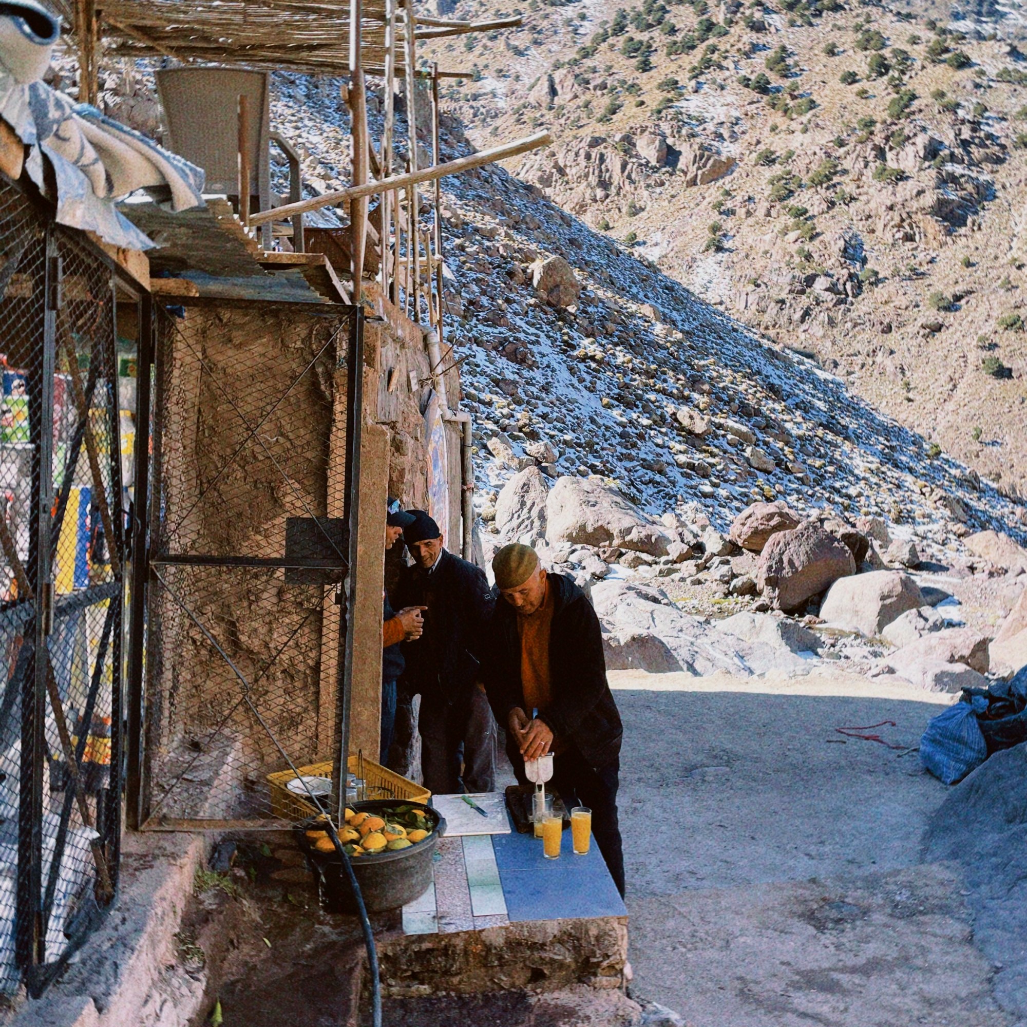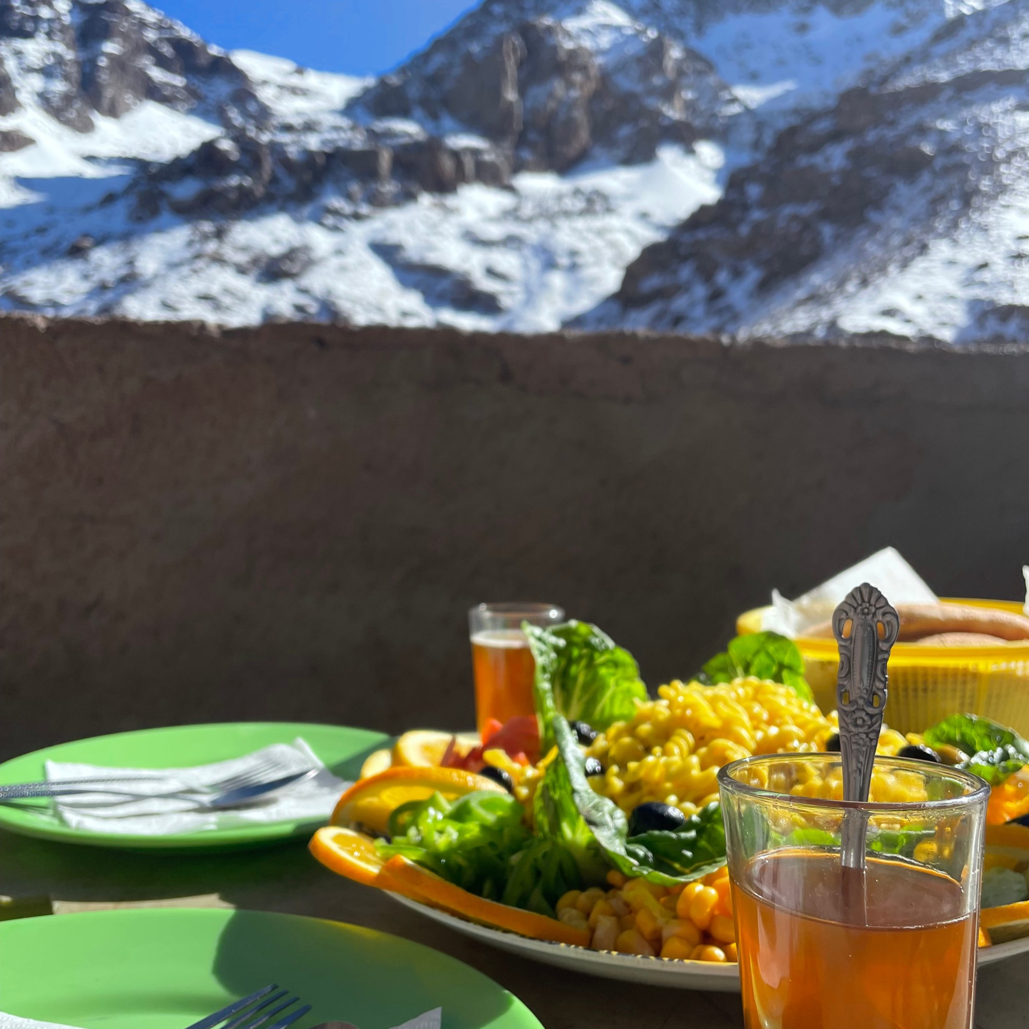 We left Marrakesh early and arrived in Imlil about two hours later, the starting point of our hike. Our gear was quickly assembled, the food loaded onto the mule and after one last tea with our guide, we were off. The first stretch was rather gentle, giving us time to chat with our guide and hear the stories of his countless climbs. Along the way, small huts were offering drinks, snacks or even proper meals. We stopped for water a couple of times, but our guide seemed to have a different lunch spot in mind for us. After 4 hours (incl. breaks), we reached the last hut before the basecamp where we sank down onto the plastic chairs with the sun on our faces, happy to finally give our exhausted legs a rest. We were presented with an opulent lunch that neither of us had expected: a big pasta salad with vegetables, bread and a Moroccan spiced omelette. It might’ve been the mountain air, but that omelette was the best I’ve ever tasted.