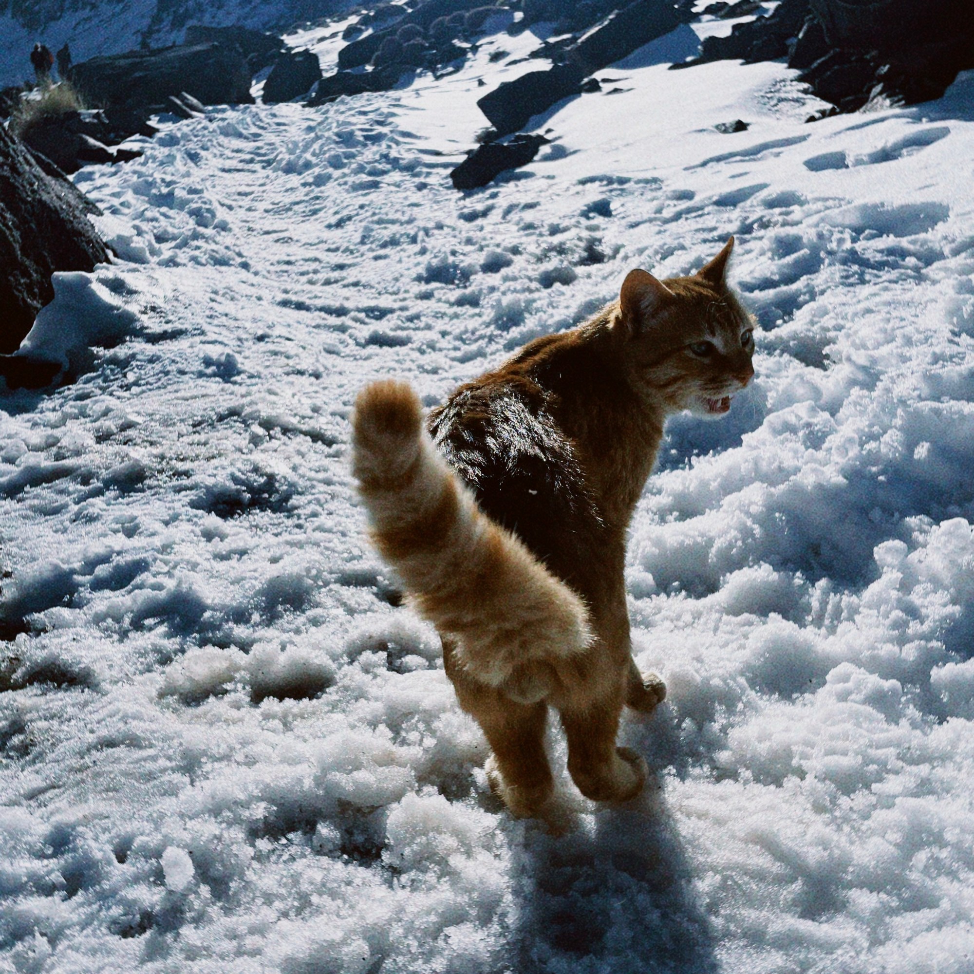 Re-energized, we tackled the final hour to the refuge, now well above the snow line. Thankful for our hiking sticks and grip, we followed the icy path, occasionally joined by a mysterious ginger cat .How she got up there, will forever remain a mystery.